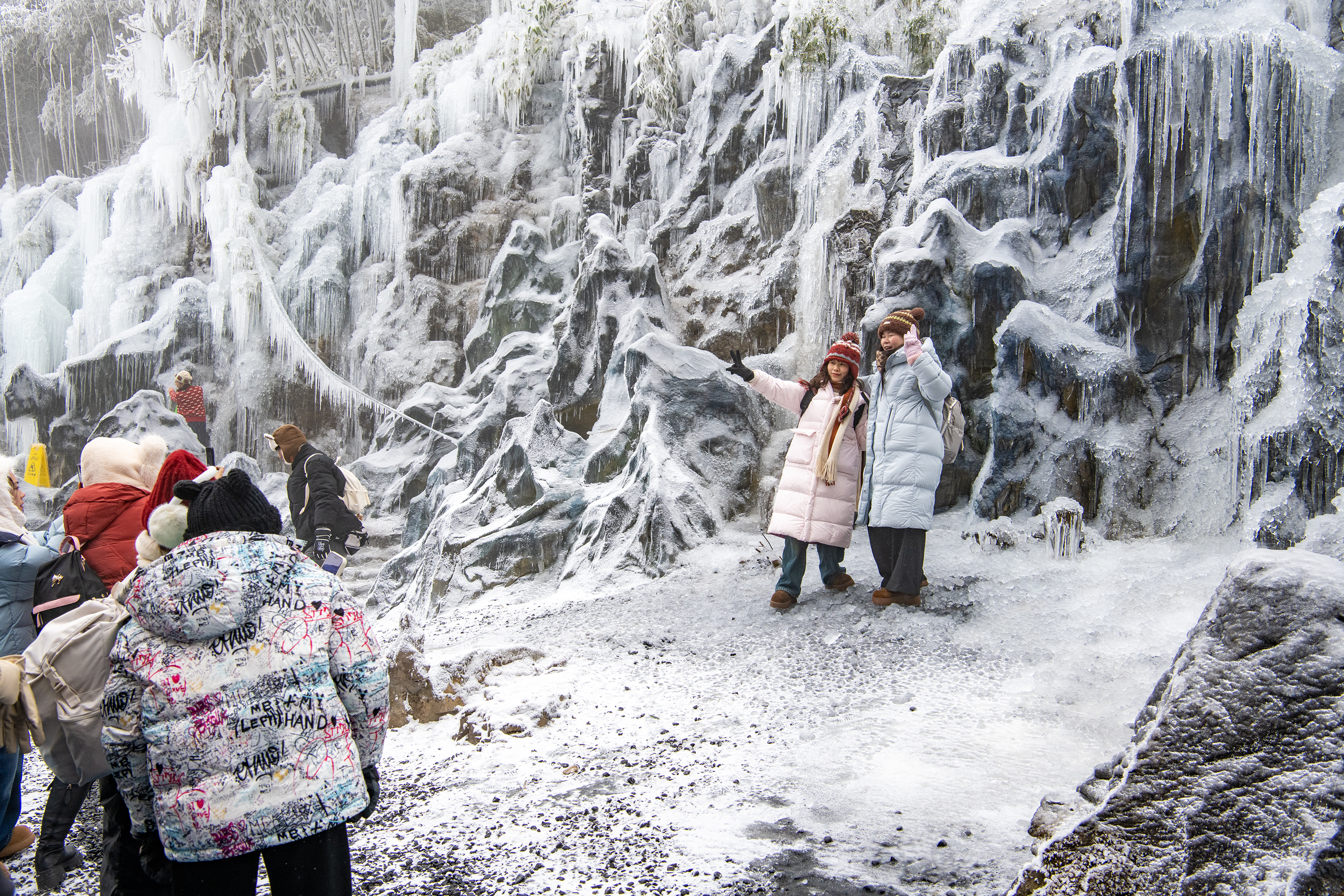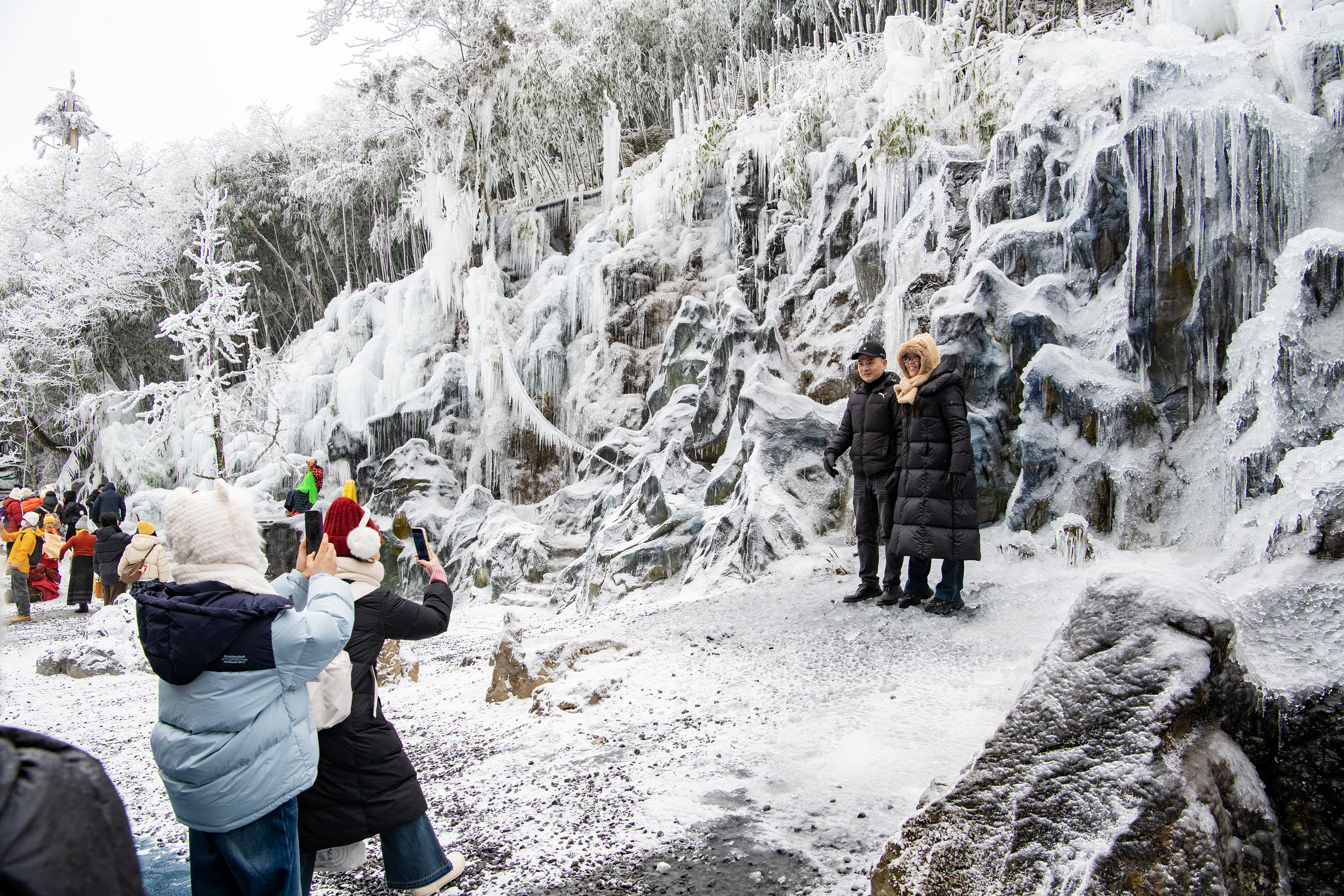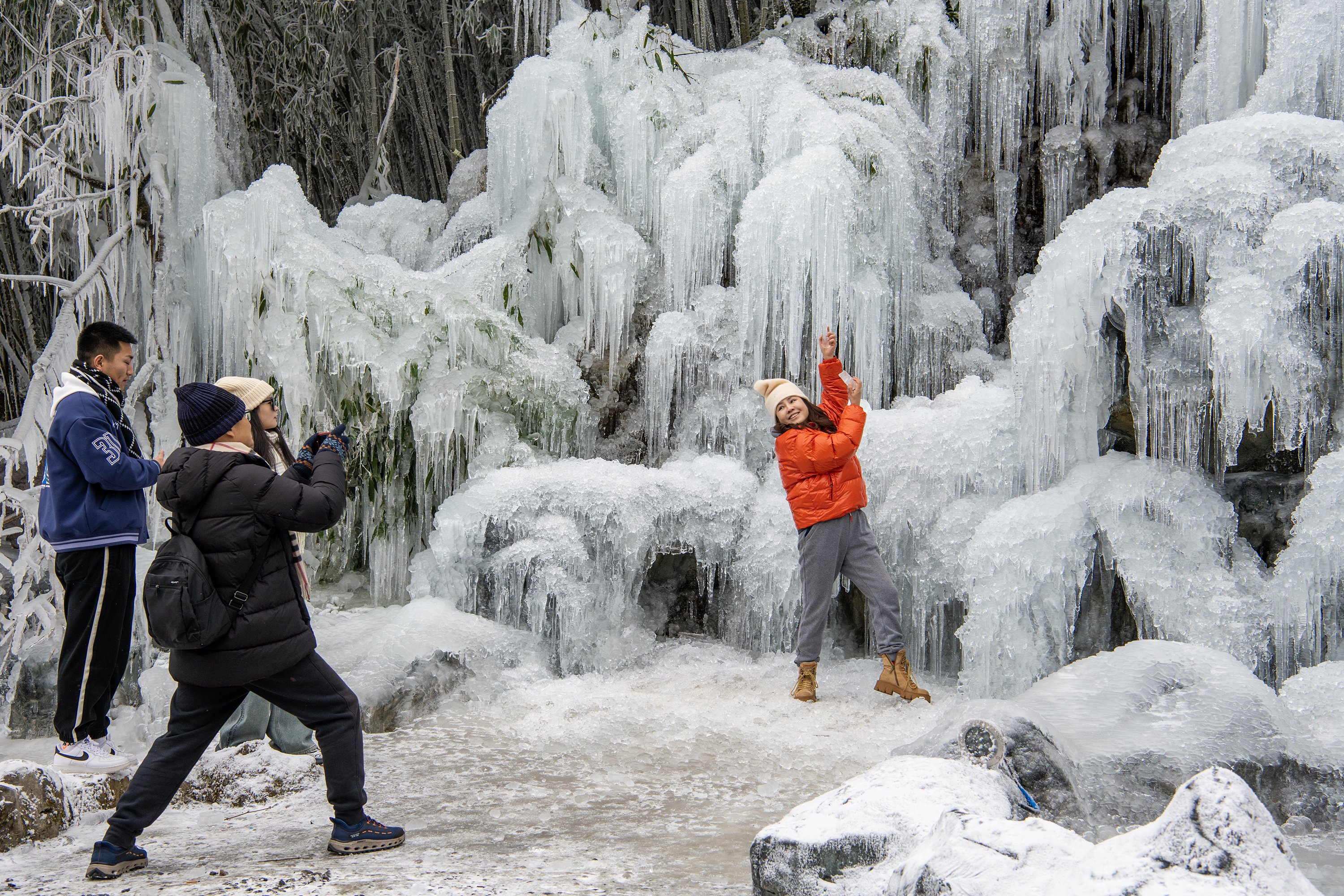 1月5日,南川区金佛山景区观霞台,游客在晶莹剔透的冰瀑下拍照打卡。通讯员 胡波 摄