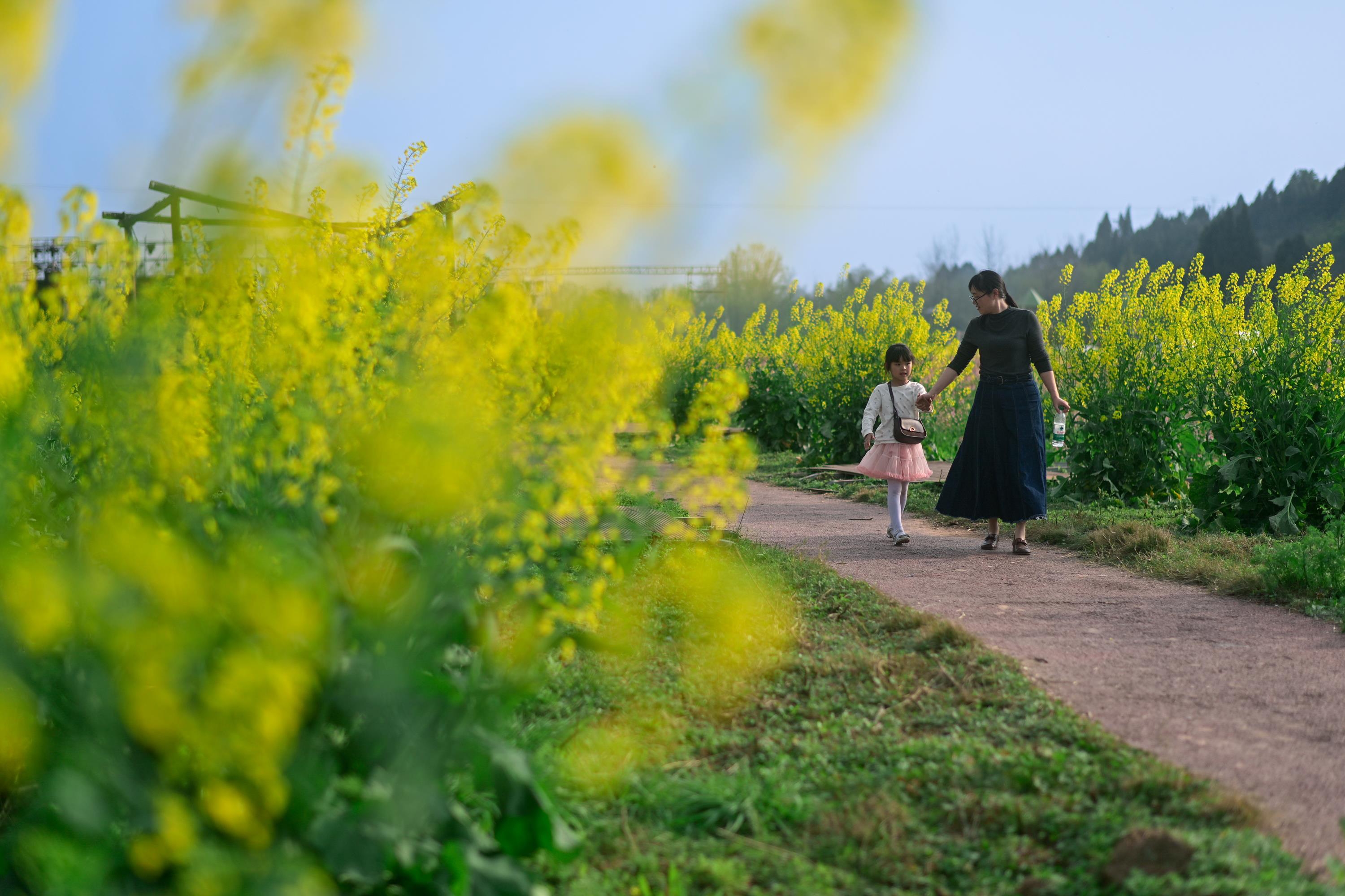 2月27日,潼南区崇龛镇陈抟故里景区,一对母女在油菜花地里赏花游玩。记者 张春晓 摄