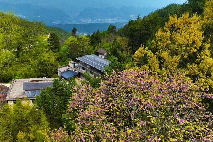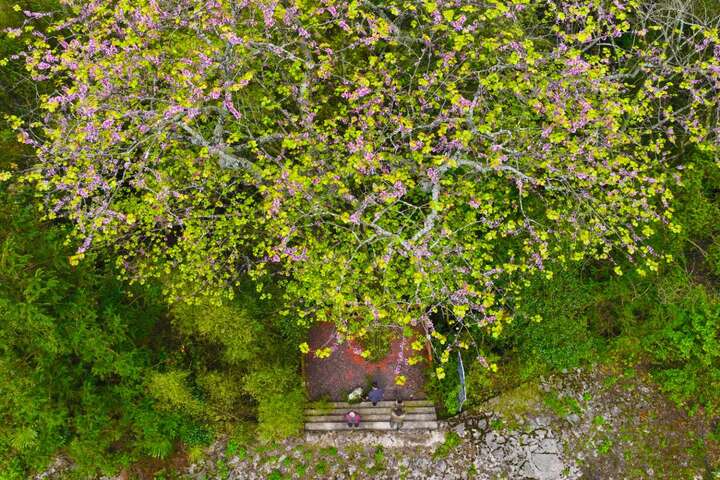 据了解,柒坨村有1万多亩野生紫荆树带,其中一株已有280多年的历史。时下,野生紫荆花开,一山连一山,形成一片紫荆花海,粉红的花朵与各种绿树相间,像锦缎铺在山间,美不胜收,吸引了不少游客前往观赏、游玩。