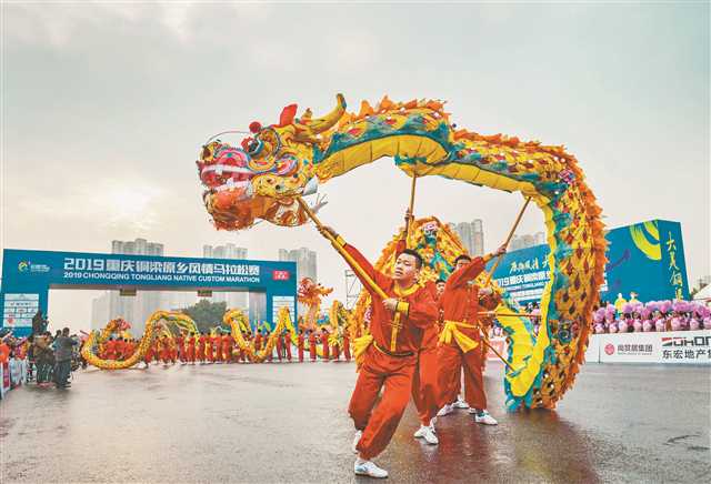 2019重庆铜梁原乡风情马拉松赛,文艺表演团队舞龙为万名跑友“神龙壮行”。记者 龙帆 摄