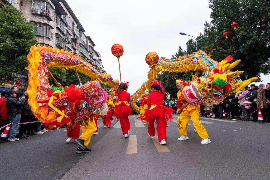 五大特色节目轮番上阵,尽显川渝民俗魅力。《鼓舞丰收》铿锵启幕,以激昂鼓点暖场开篇;《锦绣白沙》锣鼓齐鸣,本地团队演绎民俗风韵;《锦鲤戏春》灵动登场,槽坊社区鲤鱼灯队俏皮献艺。更有《二龙戏珠》《龙腾四海》等节目依次亮相,各团队同台竞彩,传统民俗与现代演绎巧妙交融,勾勒出锦绣白沙的幸福图景。
