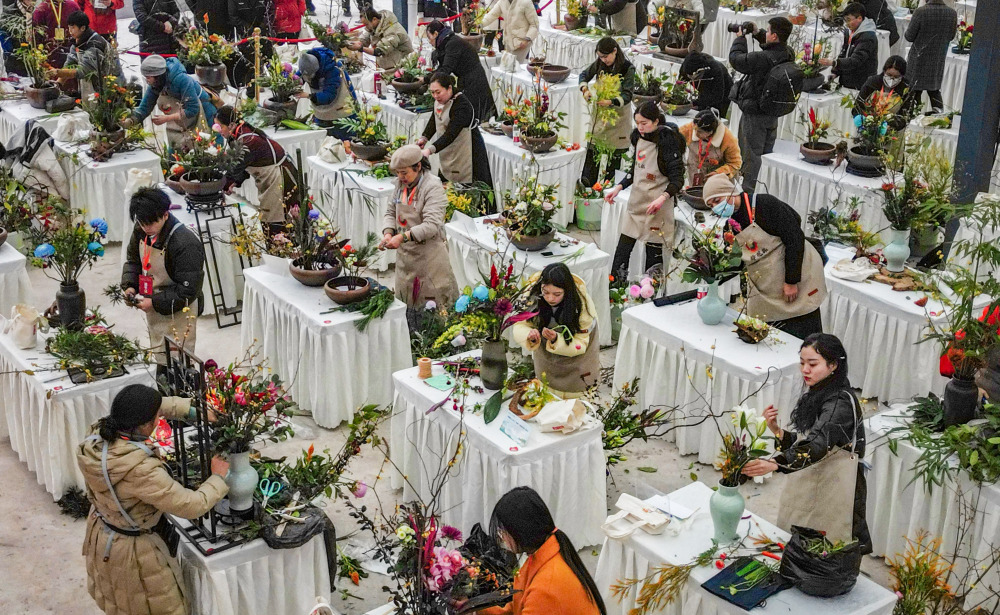 值得一提的是,本次艺术节兼具专业性与公益性。艺术节系列活动之一的第六届“静观杯”传统插花大赛邀请了专业的插花花艺选手,以蜡梅为主要花材现场进行花艺创作;首届川渝“匠心杯”残障人士小型组合盆栽大赛则汇聚了来自川渝两地的40名残障人士,在经过前期开班培训后,现场开展组合盆栽比赛,所有盆栽作品进行现场拍卖,所得收入将全部用于残疾人帮扶。