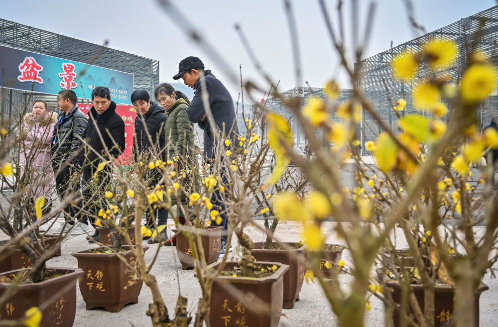 市民正在欣赏蜡梅盆景。首席记者 龙帆 见习记者 魏瑞 摄