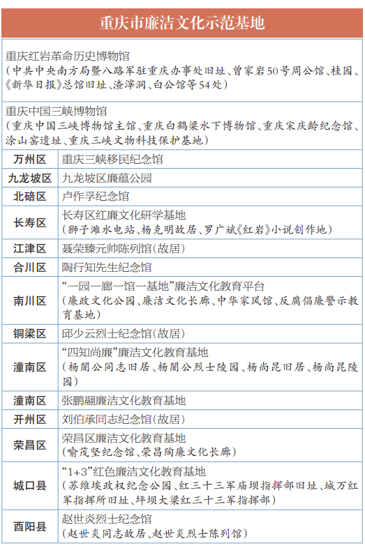 据了解,16个基地中既有具有品牌积淀,长期以来一直发挥着廉洁教育作用的基地,如重庆红岩革命历史博物馆、刘伯承同志纪念馆(故居)、聂荣臻元帅陈列馆(故居)等;又包含了新近挖掘打造且发挥作用较好的基地,如张鹏翮廉政文化教育基地、南川区“一园一廊一馆一基地”廉洁文化教育平台、九龙坡区廉蕴公园等。16个基地的文化类型涵盖革命文化、中华优秀传统文化、社会主义先进文化,充分挖掘和呈现了不同文化类型中的廉洁元素。