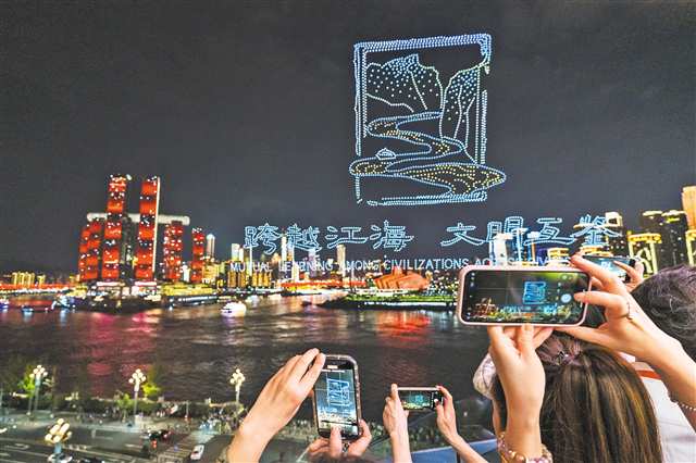 8时许,第一组无人机编队在夜空定格出“长江文明论坛”LOGO,“跨越江海 文明互鉴”的主题字样随之浮现,简洁有力的视觉语言瞬间点明活动核心。紧接着,无人机化作奔涌的银色长河,从青藏高原唐古拉山的冰雪意象开始,重庆、武汉、南京等长江流域重要城市依次显现,源远流长的壮阔场景让现场嘉宾纷纷举起相机记录,现场赞叹声一片。