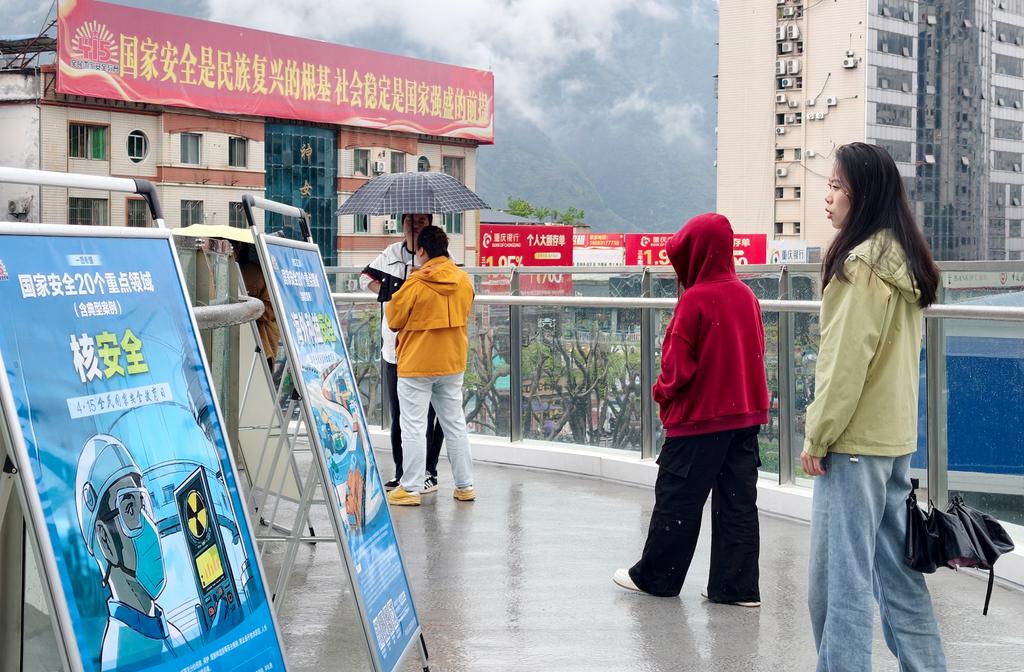 作为巫山县城核心文旅节点的神女大扶梯,中部连接天桥横跨广东路,是当地日均人流量最大的地段之一。活动期间,天桥区域以葫芦形环绕布局摆放了30块国家安全教育知识展板,内容覆盖政治安全、网络安全、粮食安全、生态安全以及保密和密码安全等20余个与群众生活密切相关的安全领域,过往的游客、上下班市民纷纷驻足观看学习。