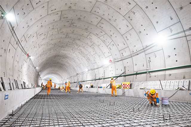 12月19日,渝厦高铁重庆菜园坝长江铁路隧道内,中铁十四局的技术工人正在进行道床板钢筋绑扎施工。