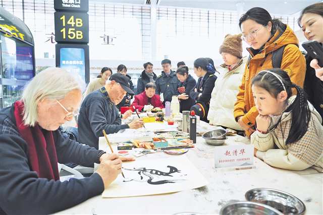 2月2日,重庆东站候车室内,书画家为旅客创作新春作品。通讯员 魏伟 摄/视觉重庆