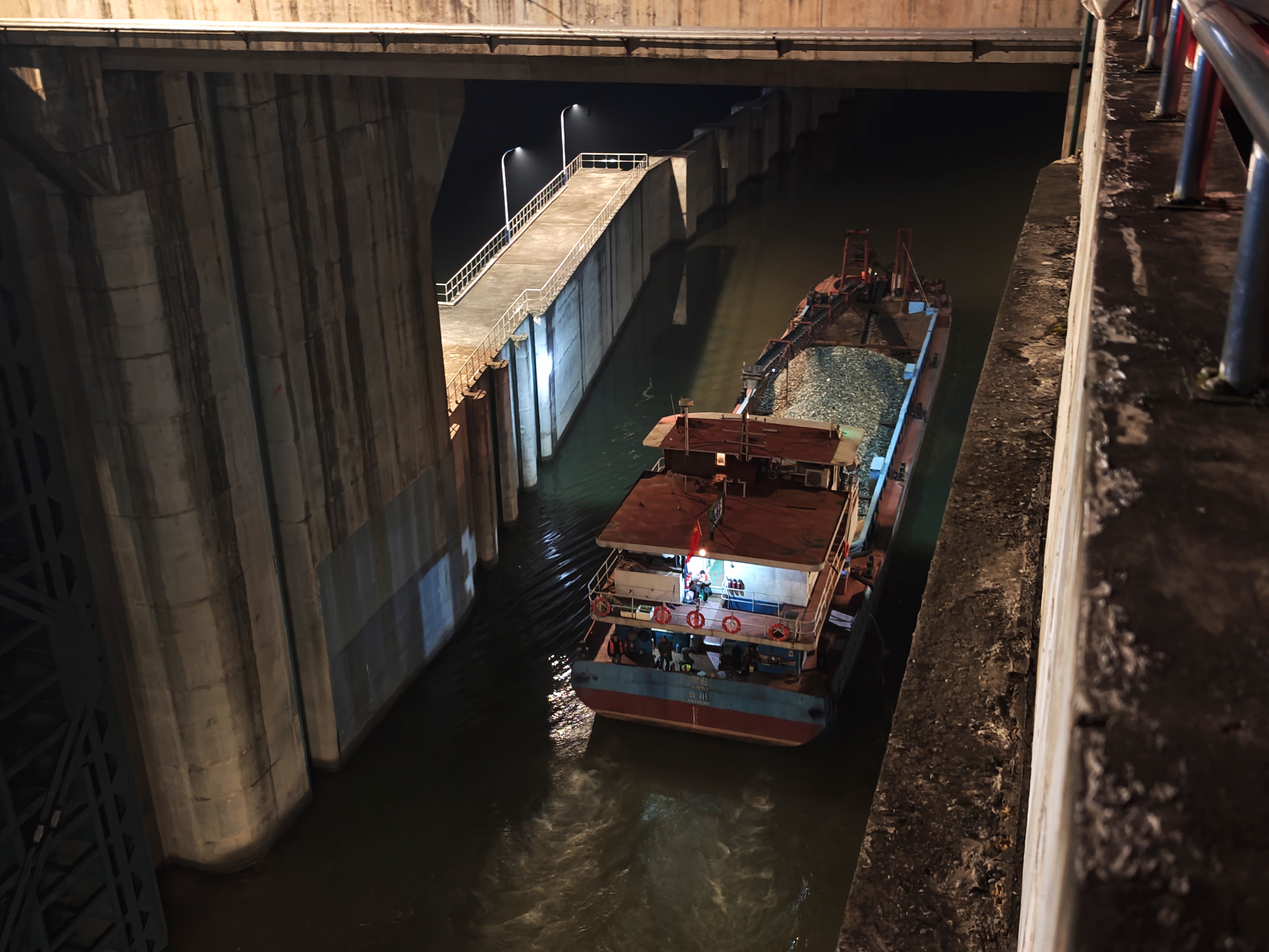 2025年12月26日,实船试验船舶夜间通过嘉陵江草街船闸。(航发集团供图)