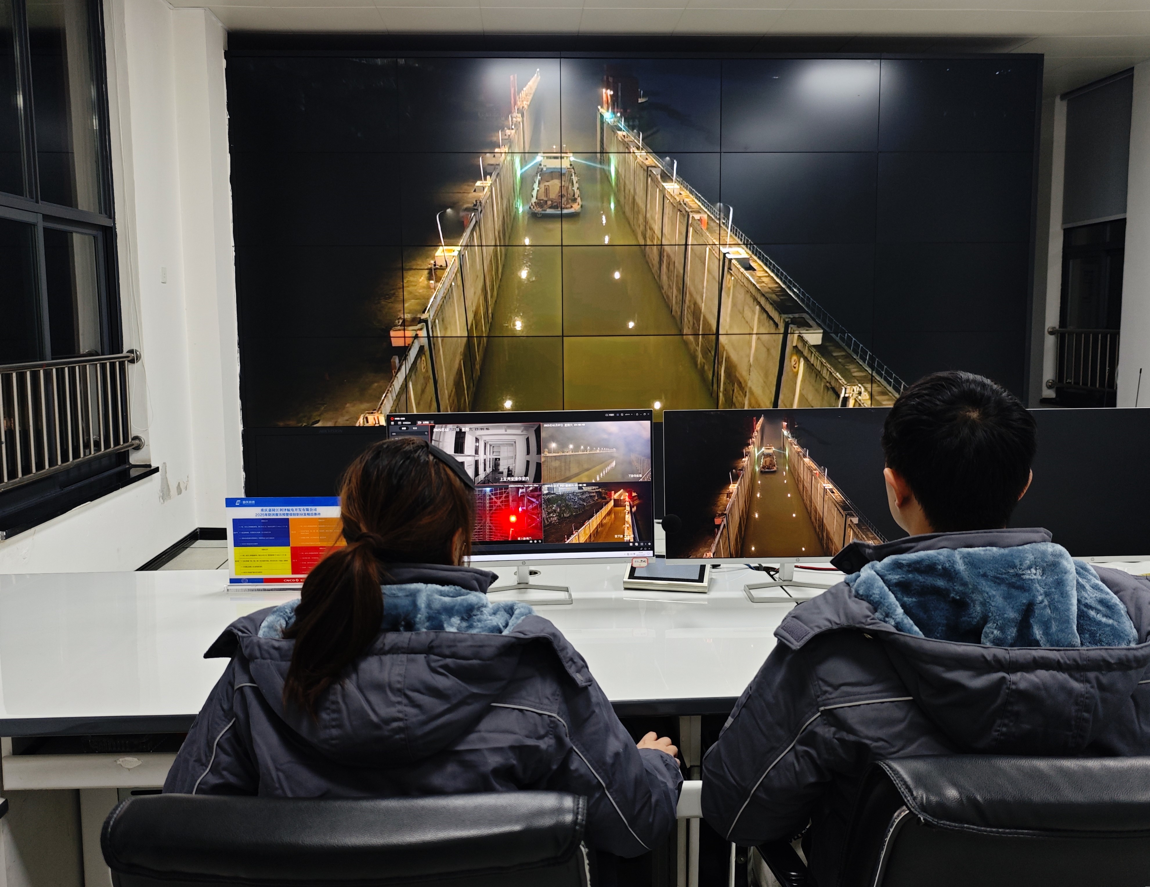 2025年12月27日晚,利泽船闸中控室调度船舶进入闸室。(重庆航发集团供图)