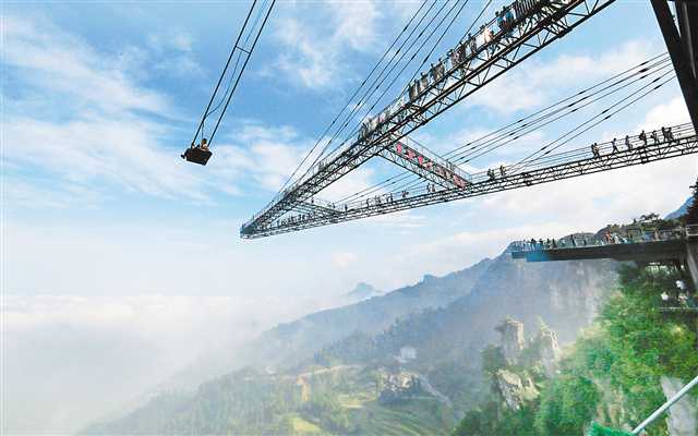 9月23日,万盛黑山谷景区天空悬廊,游客在300米高的悬崖上荡秋千。特约摄影 曹永龙