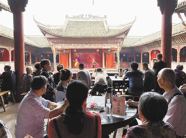 9月24日,铜梁安居古城,游客在观看川剧表演。通讯员 赵武强 摄