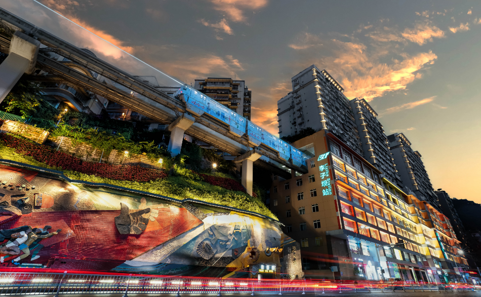 2号线李子坝站“单轨穿楼”奇景。 渝中区委宣传部供图