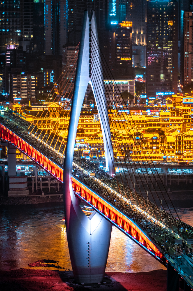 出游高峰,警方对千厮门大桥双向交通采取临时封闭,大桥俨然变成了一条“步行街”,游客们可以在桥面上随意行走观看,在“最佳拍照点”摄影、拍照留念。(资料图)重庆城市影像师 张坤琨 摄