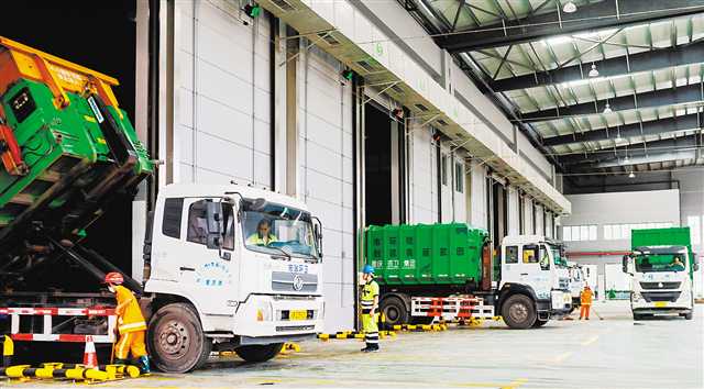 一是三类垃圾一体化转运。传统垃圾中转站只能分开处理生活垃圾、厨余垃圾、餐厨垃圾,三套系统各自运转,占地面积大、运行成本高。市环卫集团技术创新,实现走马站生活垃圾、厨余垃圾、餐厨垃圾处理系统三合一,根据三类垃圾收运时间不同,实现同一工位错峰压缩处理作业,大幅提高垃圾分类运输效率。