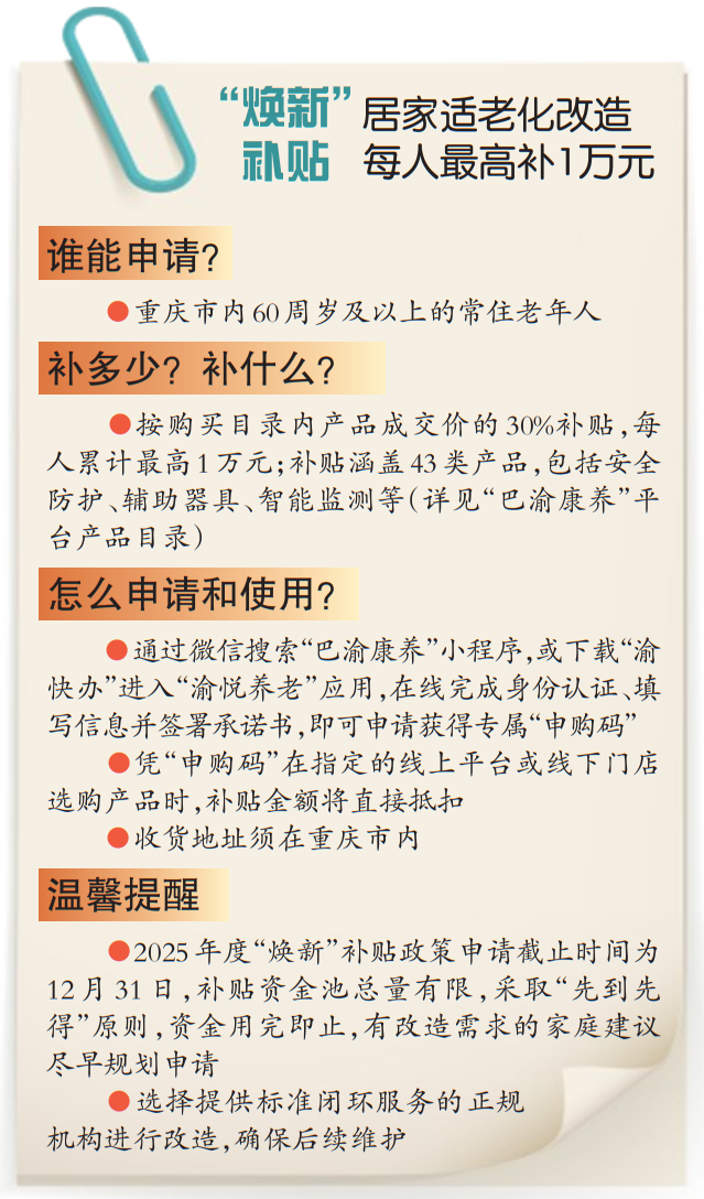 该政策面向重庆市内60周岁及以上常住老年人。老年人或其家人购买政策目录内的适老化产品,即可按成交价格的30%享受补贴,每人累计补贴总额不超过1万元。