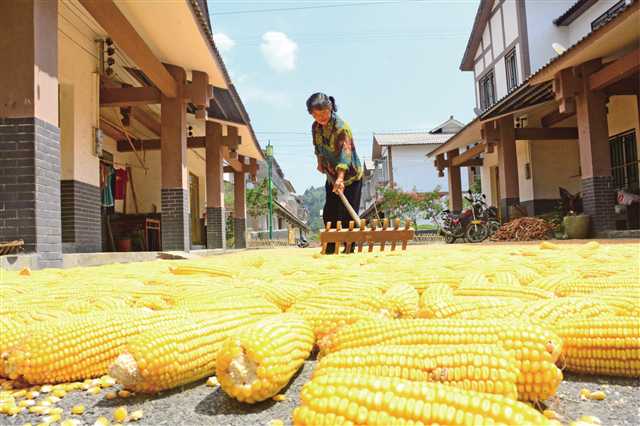 竹山镇猎神村,村民正在院坝翻晒玉米 摄/张常伟
