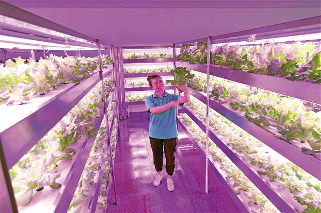 重庆数谷农场人工光源即采即食馆,工人在查看培育架上生菜的生长情况 摄/刘辉
