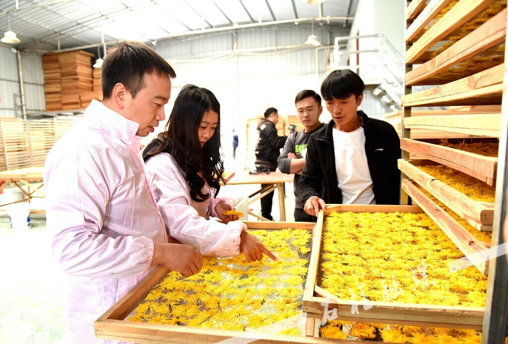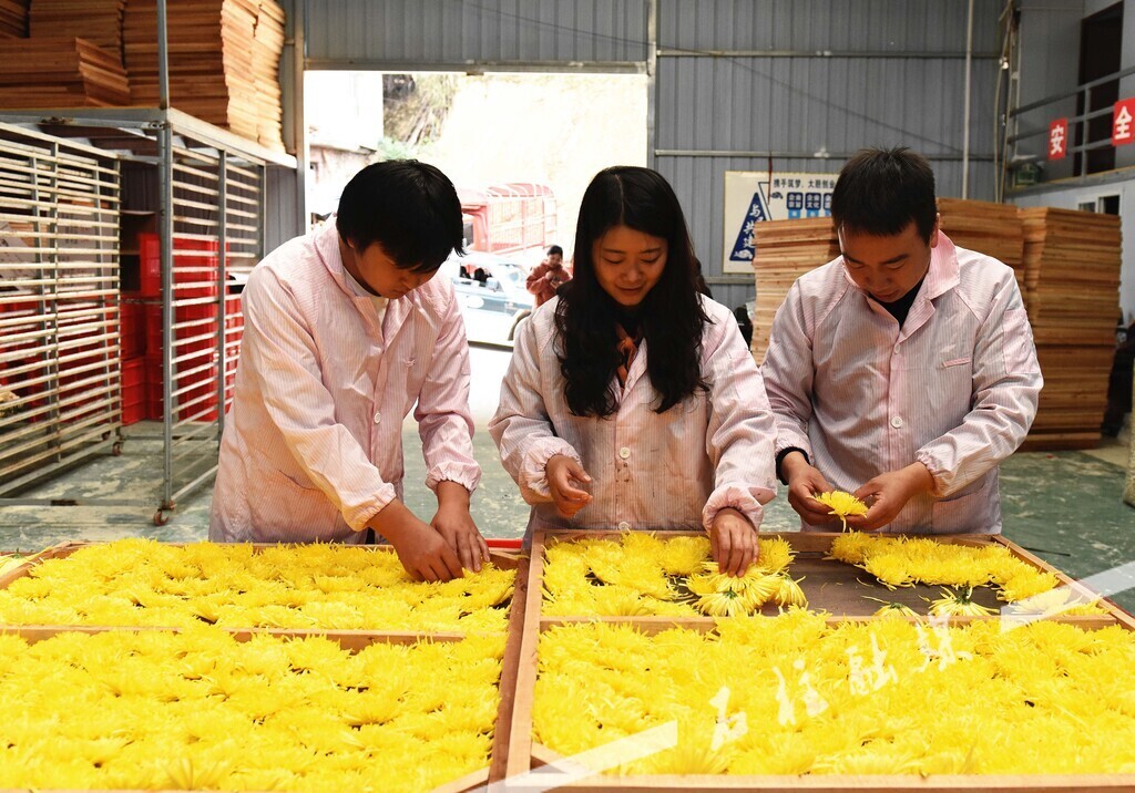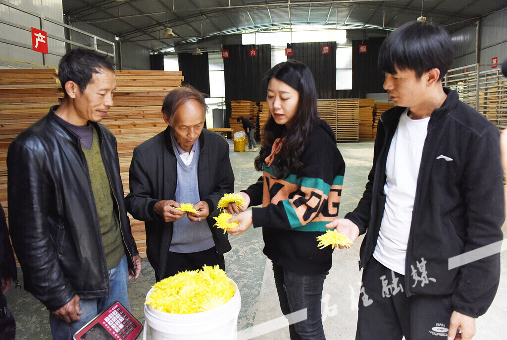 “从安徽引进的贡菊、金丝皇菊品种优良,种植出来的菊花集色、香、味、型于一体,既有观赏价值,又有药用功效。”据汪秀荣介绍,他们回乡创业组建公司、打造示范基地以来,采用“统一供种、统一管理、统一收购、统一加工、统一销售”方式,带动三星乡的群众发展起了菊花产业。