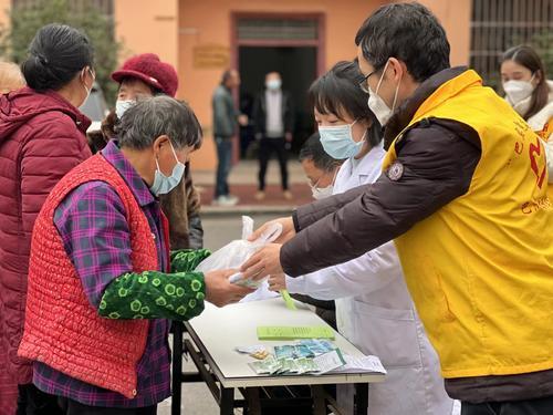 ▲工作人员正在为老年人发放“健康包”。通讯员 邹露 摄