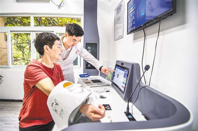 8月4日,江北区观音桥街道明珠社区健康管理服务中心,社区居民在工作人员引导下使用智能仪器进行健康检测。记者 郑宇 摄/视觉重庆