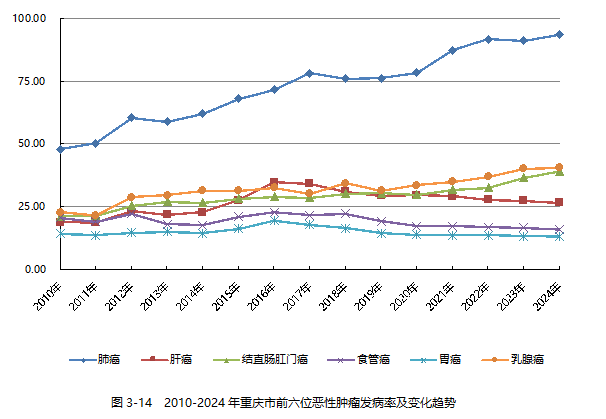 《报告》分析称,从2010年到2024年,全市前六位的恶性肿瘤报告发病率大部分呈上升趋势,少部分比较平稳,其中:肺癌发病率由48.11/10万上升至93.66/10万;乳腺癌发病率由22.89/10万上升至40.68 /10万;结直肠肛门癌发病率由21.42/10万上升至39.24/10万;肝癌发病率由18.99/10万上升至26.75/10万。