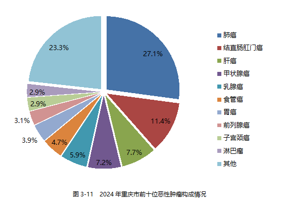 在恶性肿瘤方面,2024年全市报告肿瘤新发病例108969例,报告发病率为345.43/10万;其中,男性60118例,发病率377.90/10万;女性48851例,发病率312.41/10万,报告发病性别比1.21:1,男性高于女性。2024年前10位的肿瘤发病前10位依次是:肺癌、结直肠肛门癌、肝癌、甲状腺癌、乳腺癌、食管癌、胃癌、前列腺癌、子宫颈癌和淋巴瘤。