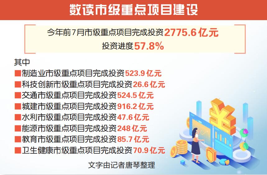 重大项目不仅牵系民生福祉,更是经济社会发展的“牛鼻子”。今年以来,重庆坚持项目为王,全力以赴抓项目、促投资、稳增长,为经济社会高质量发展注入强劲动能。市发展改革委相关负责人透露,今年前7月市级重点项目完成投资2775.6亿元,投资进度(占年度计划投资比例)57.8%。