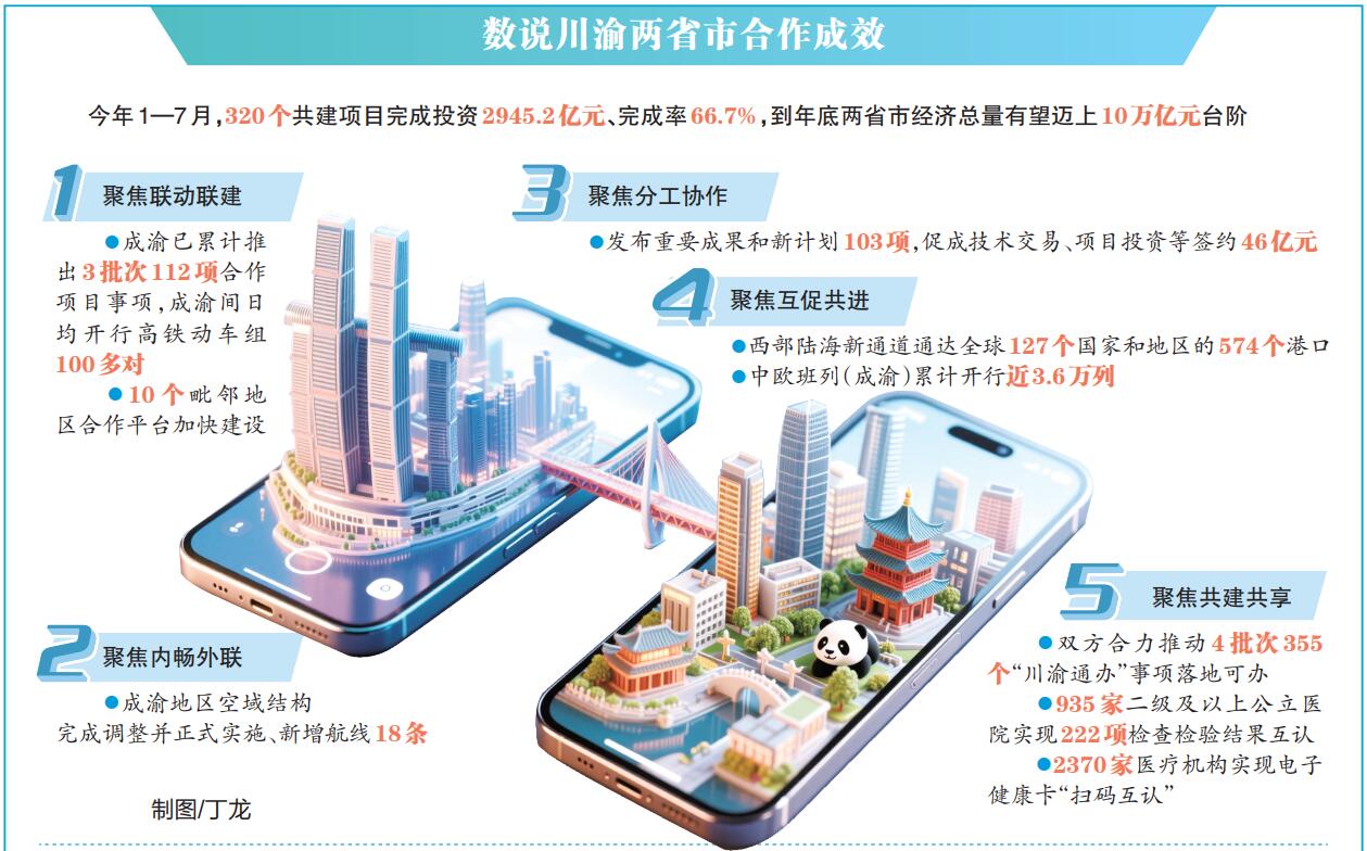 2025年是“十四五”收官和谋划“十五五”发展的关键节点,也是《成渝地区双城经济圈建设规划纲要》实施第5年。8月26日,推动成渝地区双城经济圈建设重庆四川党政联席会议第十一次会议成果发布会在重庆举行,会上晒出的成绩单显示:今年1—7月,320个共建项目完成投资2945.2亿元、完成率66.7%,到年底两省市经济总量有望迈上10万亿元台阶。