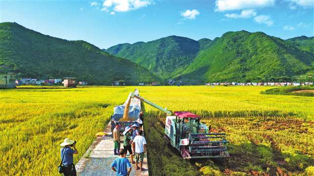巫山县庙宇镇永安村,农机手驾驶收割机在收割水稻。特约摄影 王忠虎/视觉重庆