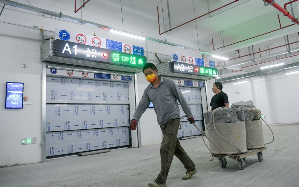 11月27日,位于两江新区礼嘉的智慧停车综合体,工人正在进行内部施工。