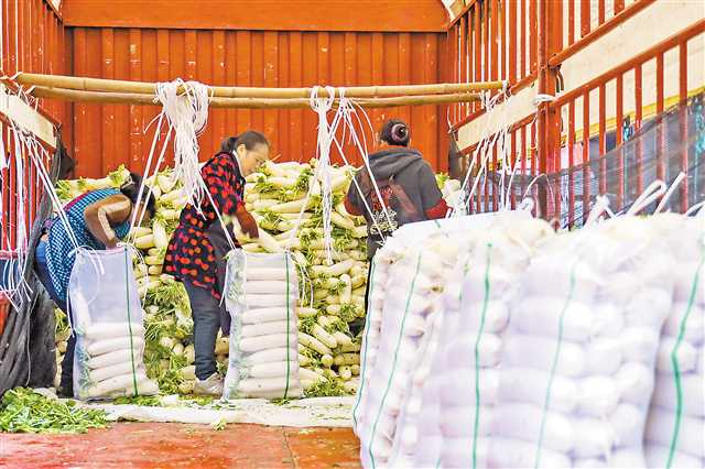 12月29日,江津双福国际农贸城,商贩正在货车上把萝卜装袋。