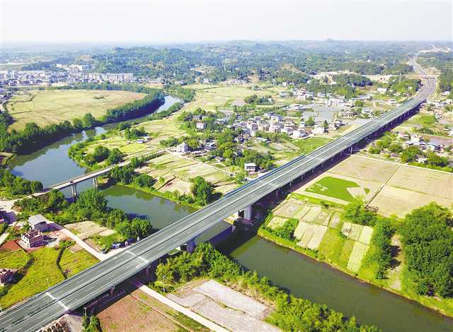 合安高速全长95公里,设计速度100公里/小时。全线建成通车后,潼南崇龛至重庆中心城区和成都中心城区的车程均在1.5小时左右,重庆合川到四川安岳则只需1个小时。图为4月29日拍摄的合安高速琼江大桥。