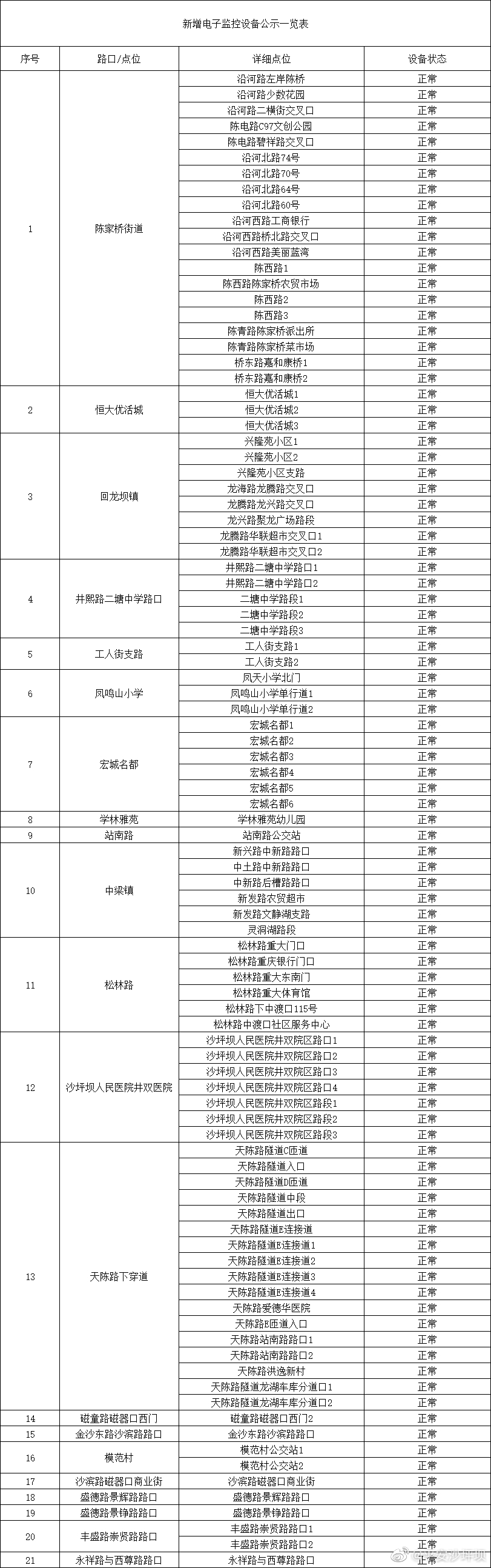 @平安沙坪坝 为进一步规范通道通行秩序,有效预防和减少道路交通事故,保障人民群众的出行安全,根据公安部《道路交通安全违法行为处理程序规定》(第157号令)第十六条规定,沙坪坝区在陈家桥街道、回龙镇等街镇以及井熙路、沙滨路等路段新增95处交通技术监控设备,主要对机动车超速、闯红灯、不按导向车道行驶、乱停乱放等交通违法行为实施抓拍处罚。