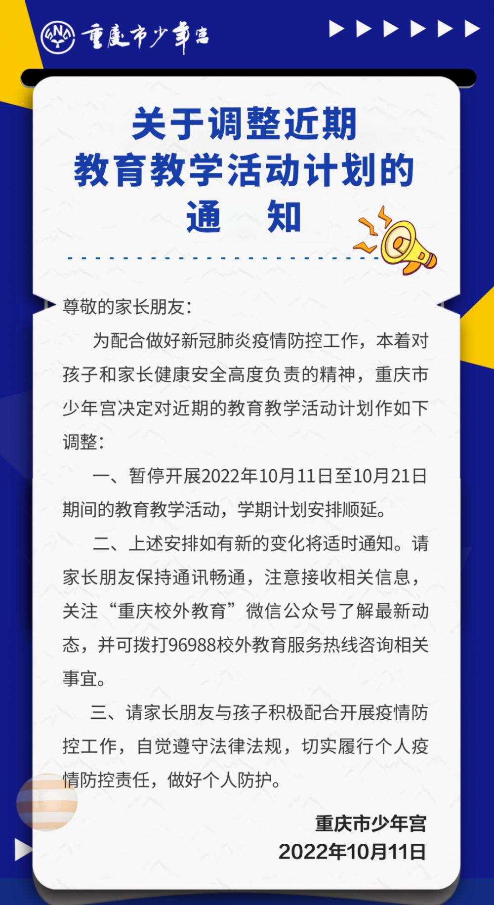 10月11日,重庆市少年宫发布通知,为配合做好新冠疫情防控工作,重庆市少年宫暂停开展2022年10月11日至10月21日期间的教育教学活动,学期计划安排顺延。