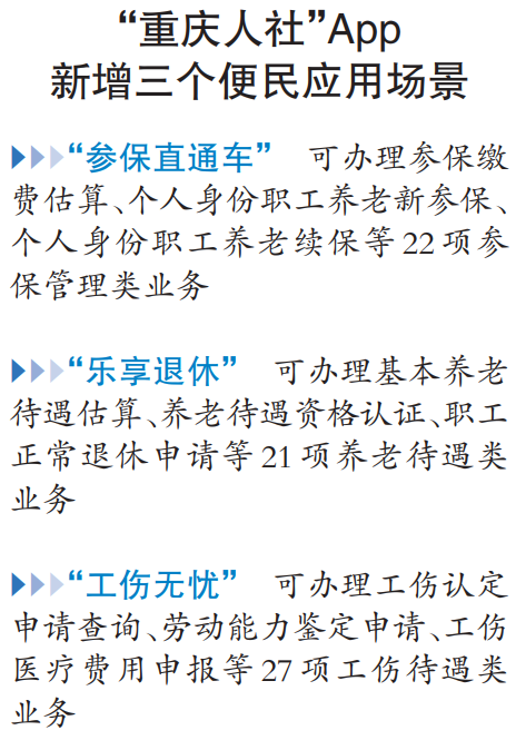 10月31日,重庆日报记者从市人力社保局召开的2023年三季度新闻发布会上了解到,近期,市人力社保局在“重庆人社”App上全新开发了“参保直通车”“乐享退休”“工伤无忧”三个便民应用场景,让群众能更高效便捷地享受社保线上服务。