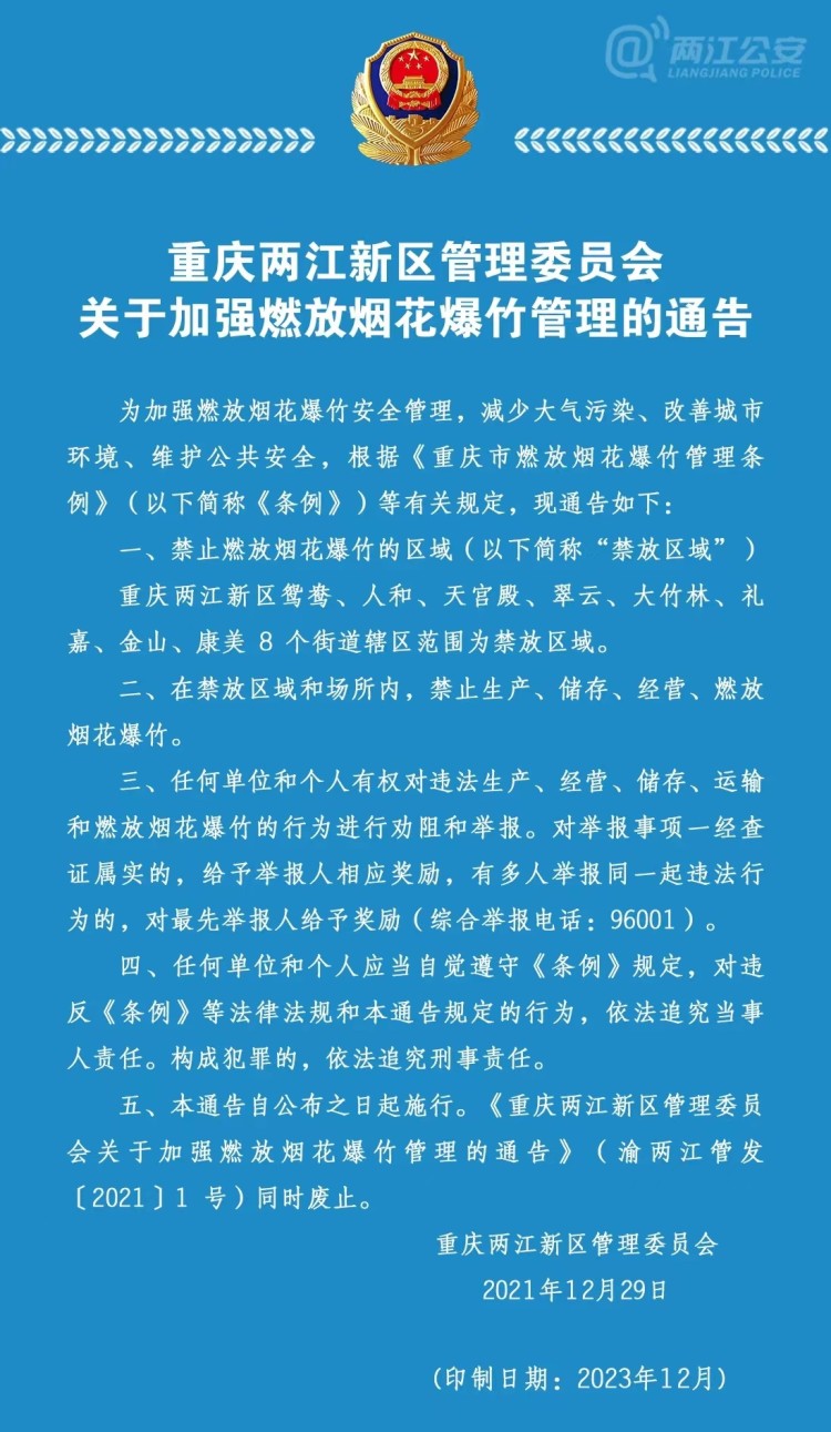 两江新区“燃管办”称,辖区两江新区鸳鸯、人和、天宫殿、翠云、大竹林、礼嘉、金山、康美8个街道辖区范围为禁放区域。在禁放区域和场所内,禁止生产、储存、经营、燃放烟花爆竹。