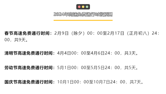 中国高速公路微信公众号也发布了2024年高速免费通行时段预测