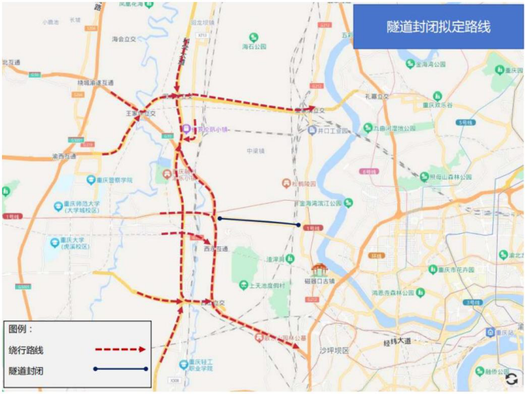 1.西永方向:西双大道赖家桥立交封闭双碑隧道入口;大学城往双碑方向车辆,从赖家桥立交西永方向进入G93成渝环线高速通过大学城隧道绕行。