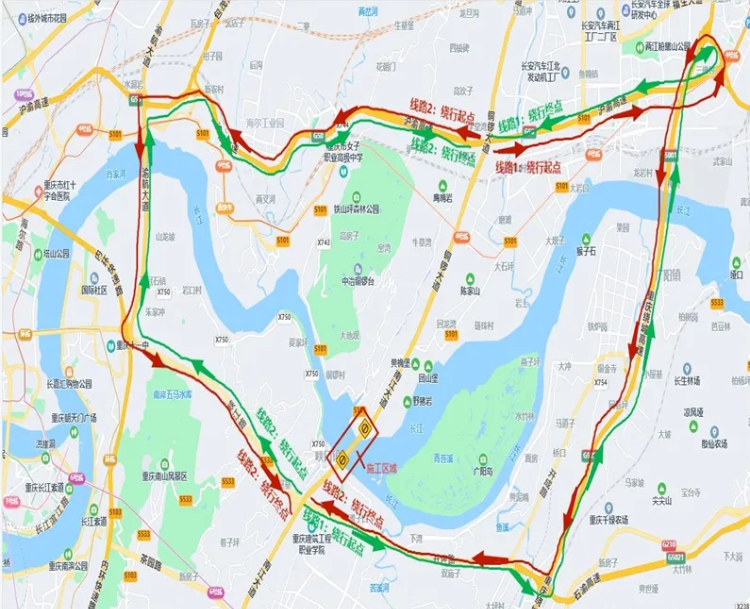线路一(绕行距离约30km):开迎路→绕城东互通→广阳互通→绕城渝宜互通→鱼嘴互通→铜锣大道