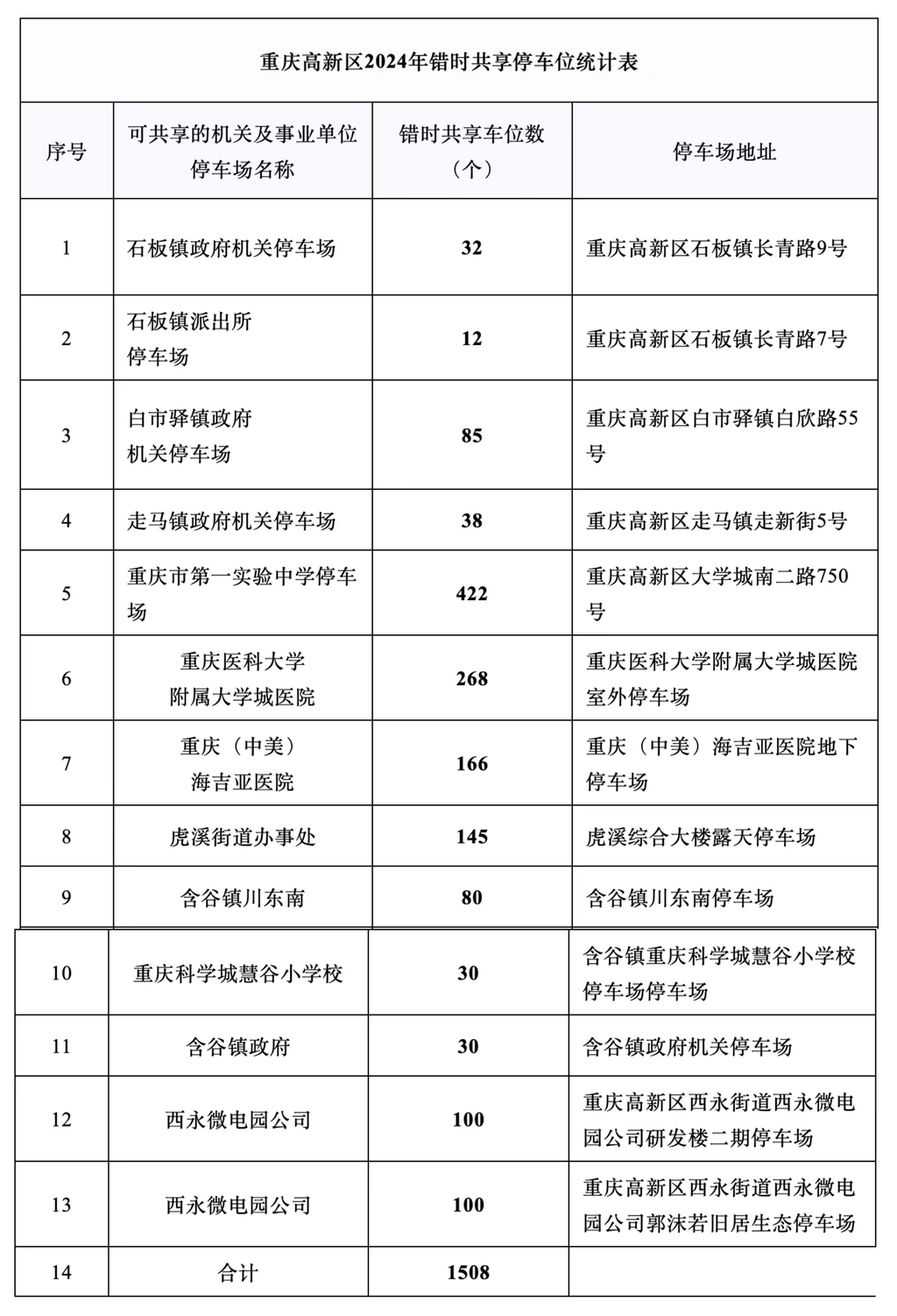 此前首批次开放的“错时共享”停车位广受市民好评,为了加大惠民力度,今年二季度科学城协调含谷镇、虎溪街道、西永街道等机关单位、西永微电园、城市运营集团等国有以及重庆市第一实验中学等中小学事业单位专用停车场既有停车资源,提供免费、低偿“错时共享”停车位1508个,将相关单位夜间闲置停车资源错时共享给周边居民。