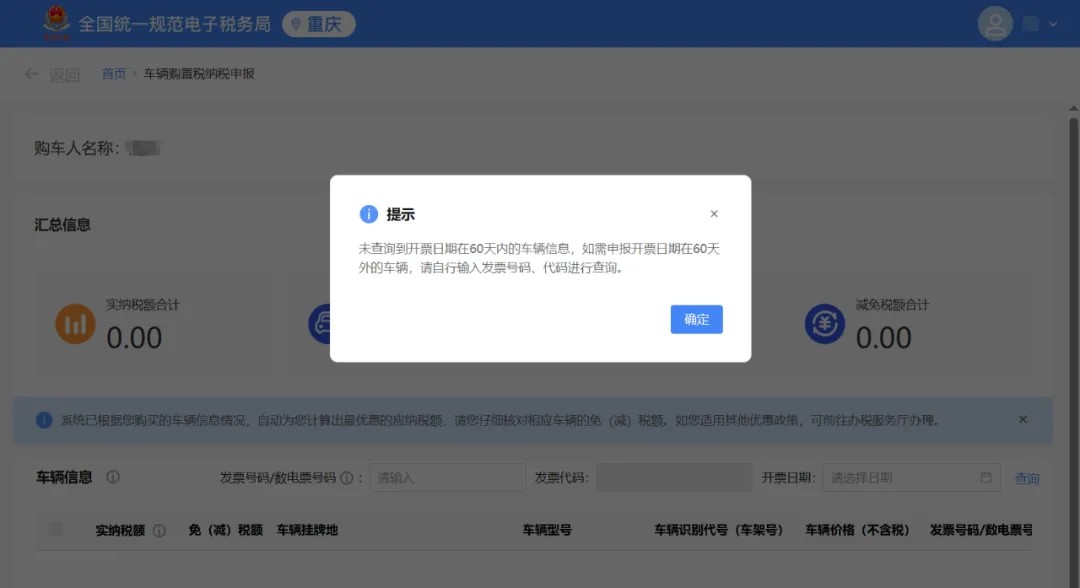 若在购置应税车辆之日起60日后申报车辆购置税,系统无法自动带出,需要自行输入发票号码、发票代码进行信息查询。