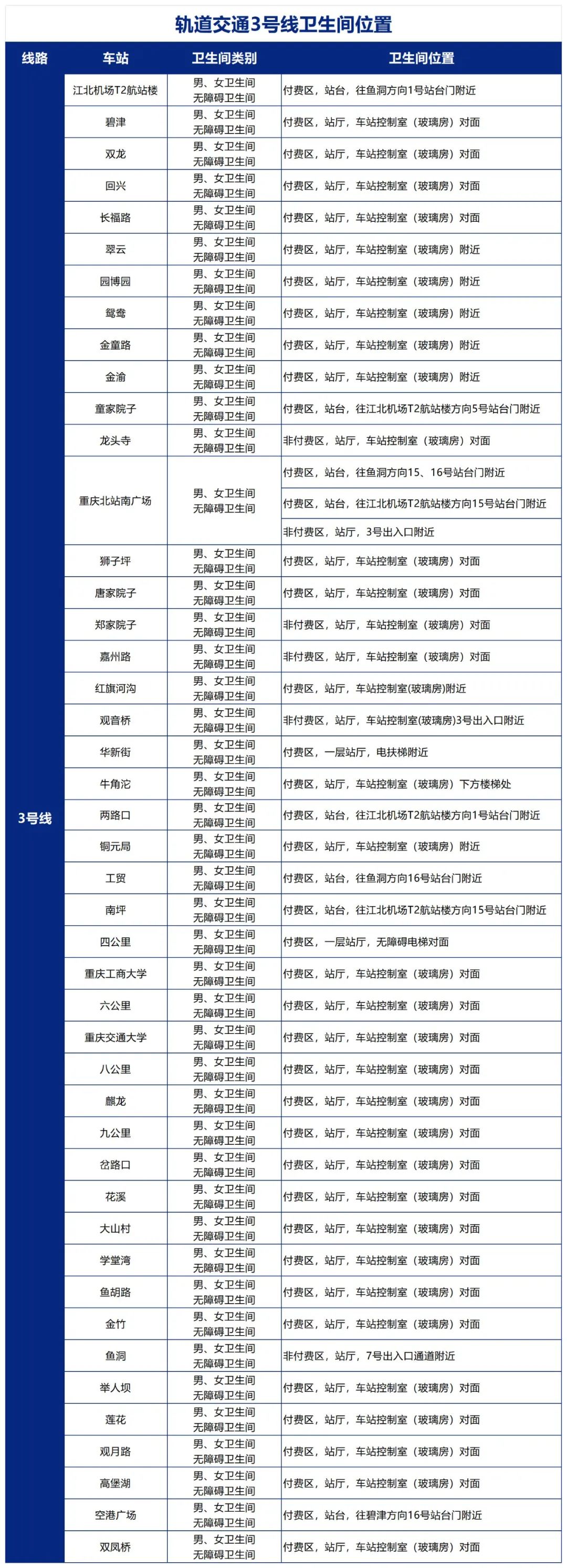 卫生间在哪里?不管是出门旅游还是日常出行,“拉撒”都是人生大事。为了方便乘客在出行过程中,快速找到卫生间解决“人生大事”,小编整理了重庆轨道交通大部分线路卫生间分布情况,以解决大家的燃眉之急。