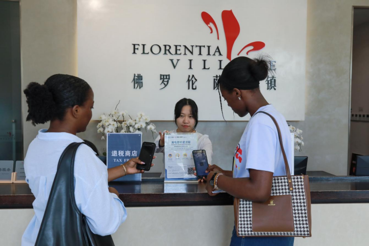 在佛罗伦萨小镇重庆名品奥特莱斯客服中心,外国旅客扫码办理离境退税“即买即退”。何献 摄