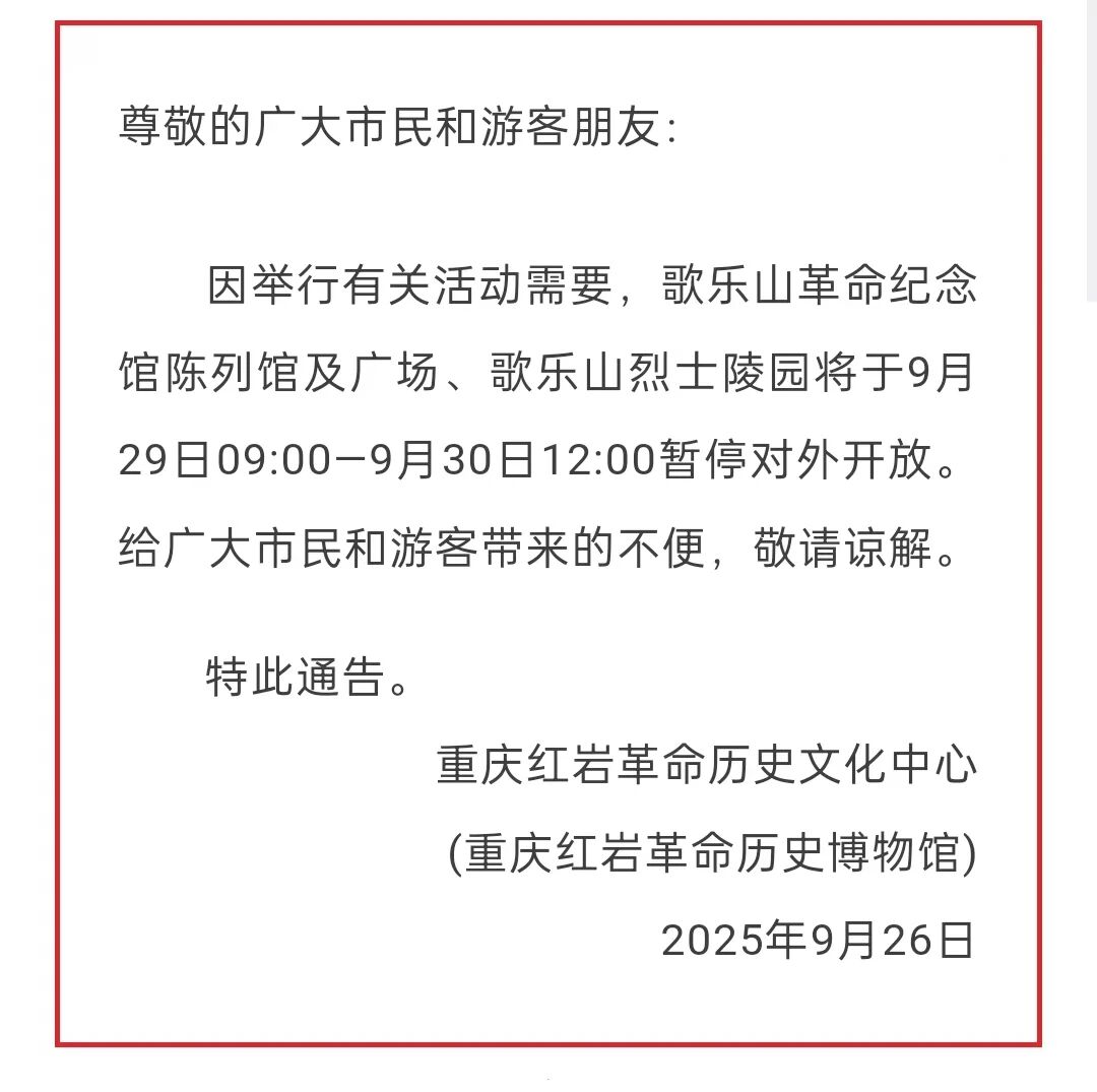 9月26日,重庆红岩革命历史文化中心(重庆红岩革命历史博物馆)发布通告,因举行有关活动需要,歌乐山革命纪念馆陈列馆及广场、歌乐山烈士陵园将于9月29日09:00—9月30日12:00暂停对外开放。9月26日,重庆红岩革命历史文化中心(重庆红岩革命历史博物馆)发布通告,因举行有关活动需要,歌乐山革命纪念馆陈列馆及广场、歌乐山烈士陵园将于9月29日09:00—9月30日12:00暂停对外开放。