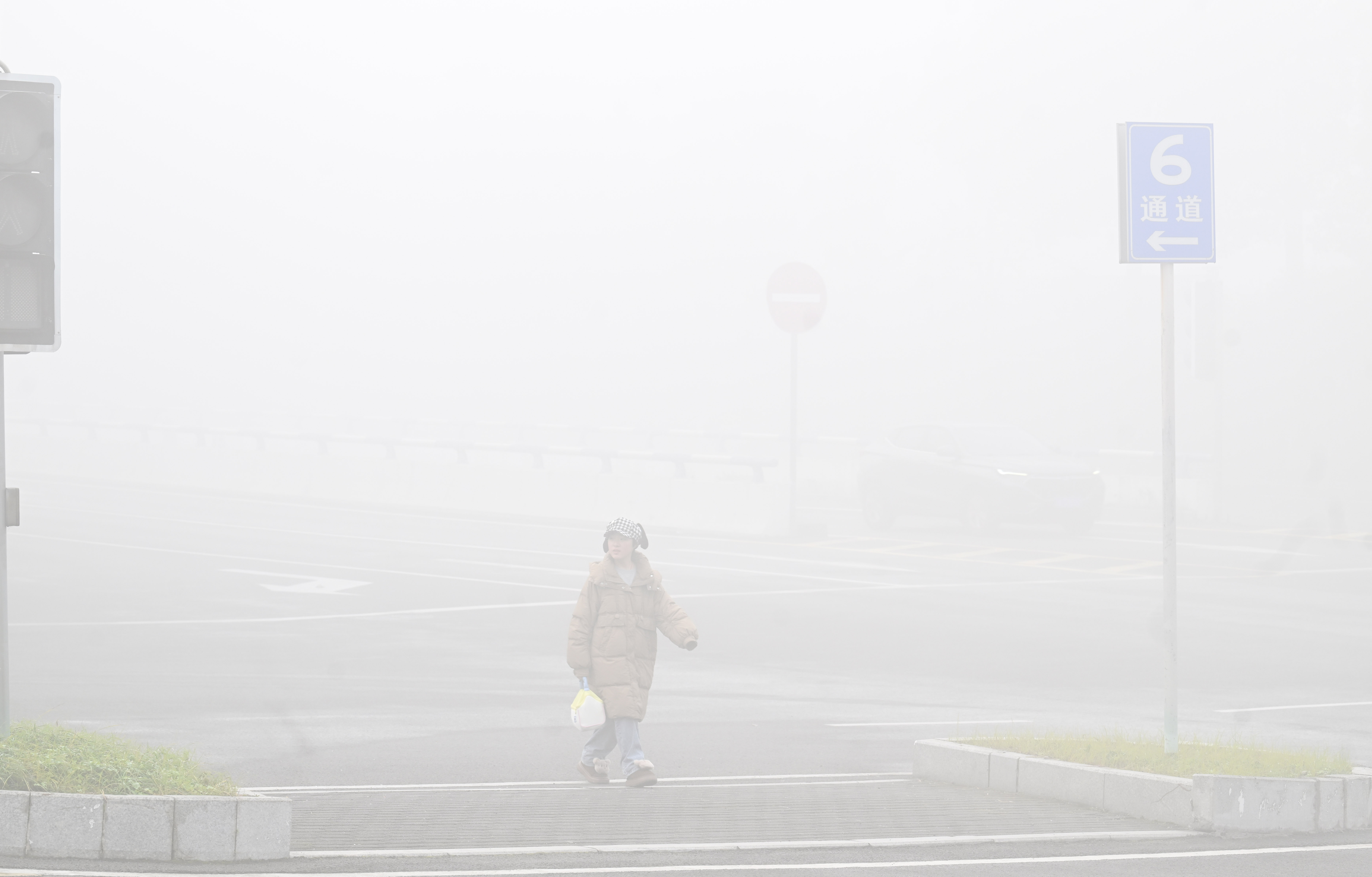 12月1日清晨,两江新区悦来重庆国际博览中心被浓雾笼罩,行人缓慢通过路口。记者 张锦辉 摄/视觉重庆