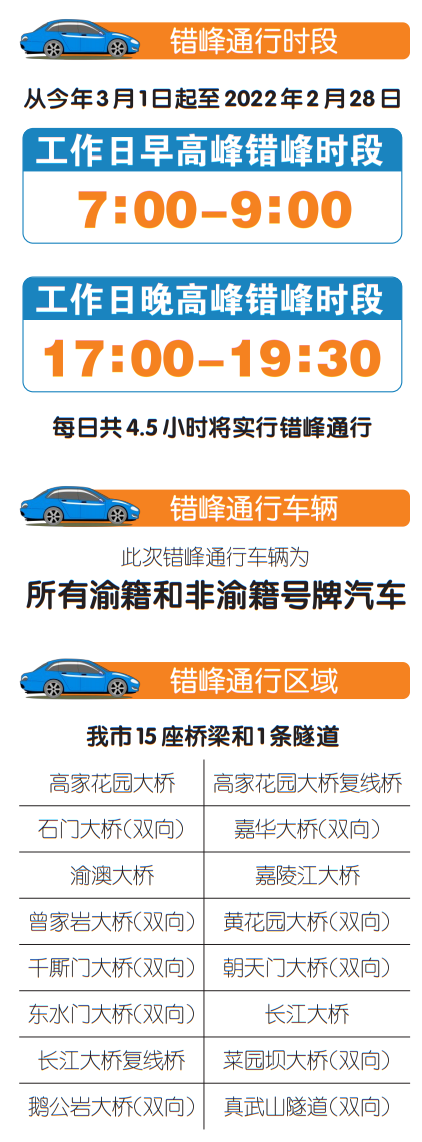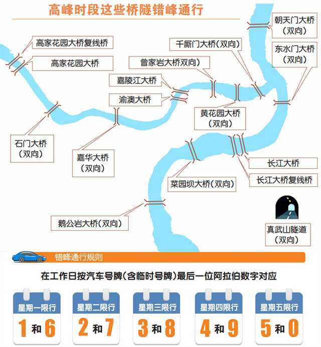 2月1日,市公安局交巡警总队正式发布《重庆市公安局交通管理局关于中心城区高峰时段桥隧错峰通行的通告》。《通告》规定: