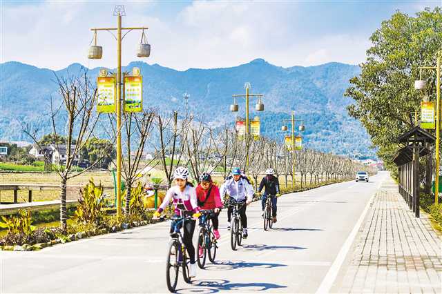 2月24日,垫江县沙坪镇毕桥村,游人在美丽宽阔的乡村道路上骑行。记者 齐岚森 摄/视觉重庆