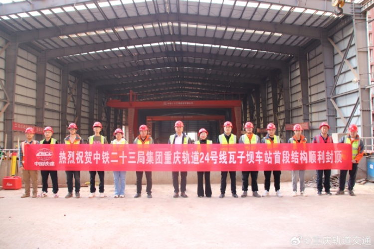 @重庆轨道交通消息, 10月21日,由重庆轨道集团建设、中铁二十三局负责施工的重庆轨道交通24号线瓦子坝站迎来首段结构封顶,为瓦茶区间盾构接收提供必要条件。