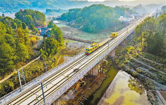 2月9日,南川区大观镇铁桥村,渝厦高铁重庆东至黔江段,施工人员正在忙碌,确保今年如期开通。